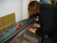 Then dry it, and put masking tape over the whole of the back surface with a long overhang on both sides that you can use as ‘handles’. This stops the etching fluid eating into the plate from the back. I had my doubts about masking tape, I thought we’d have to use stronger tape, but it worked just fine.